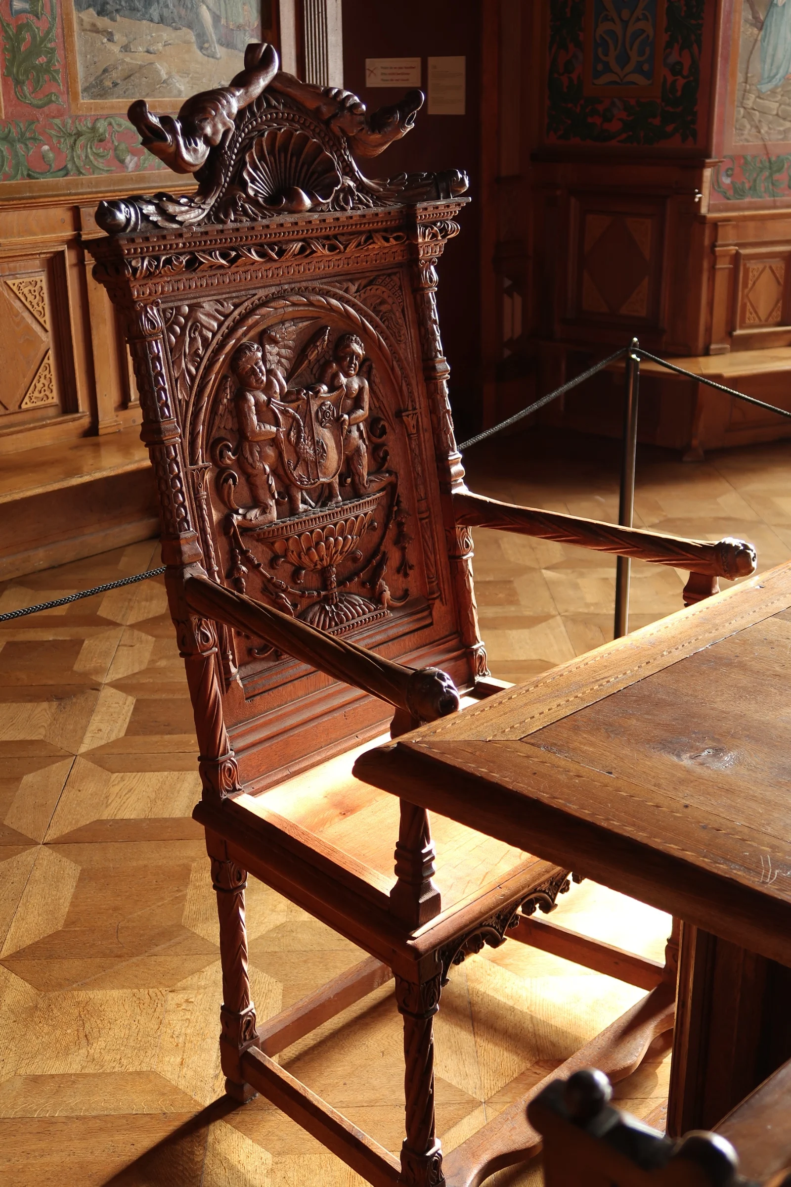 1452 AD. Chair at the head of a dining table in the Château de Gruyéres, Gruyere, Switzerland.