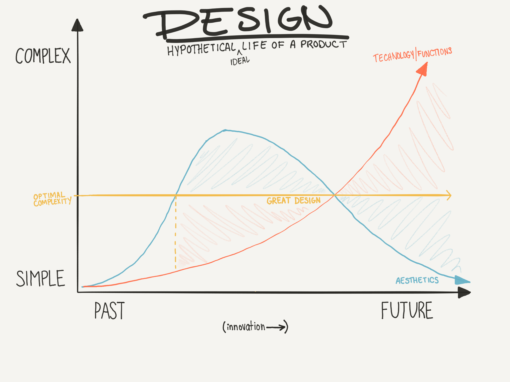 I hypothesize that our brains enjoy a certain level of complexity, or stimulation, from the objects we interact with. Too much complexity stresses us out, but too little bores us. We seek just the right amount. And that amount indicates what we consider great design. When the balance is thrown too far off for too long, it is time to scrap innovation and turn to invention.